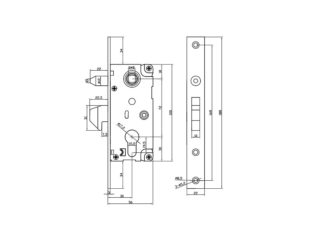 Satos Prostějov a.s > Zámky, vložky, klíče > Zadlabací zámky do dveří > Zámek s hákem+trn s vložkou 447/S 72/30/57 (převod)