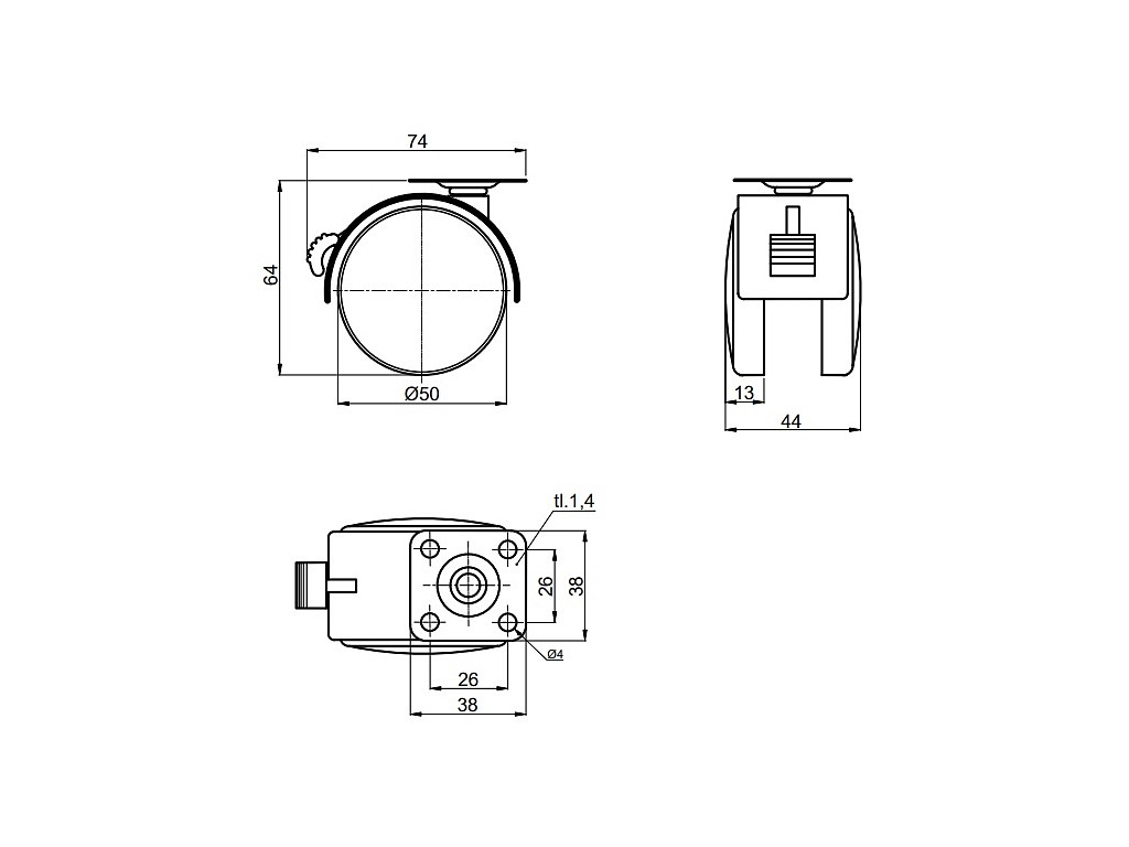 Satos Prostějov a.s > Nábytkové kování a závěsy > Kolečka nábytková > Kolečko ROL-N 50-kovová plotýnka+brzda TWP50B