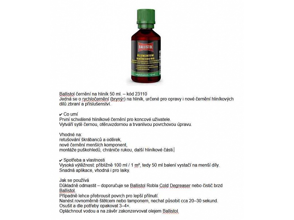 Satos Prostějov a.s > Dílna, zahrada, nářadí > Oleje a spreje a čistící prostředky > Rychločernění na hliník 50ml, BALLISTOL 23110