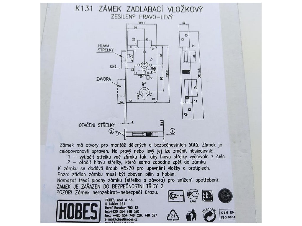 Satos Prostějov a.s > Zámky, vložky, klíče > Zadlabací zámky do dveří > Zámek vložkový vratový K131 BZn P-L 90/99